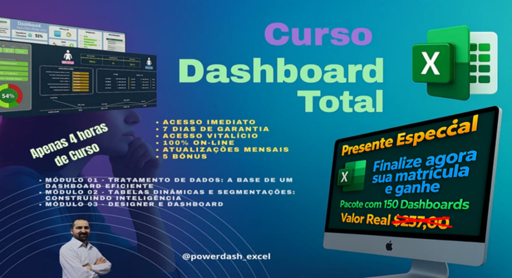 Se quiser aprender passo a passo como automatizar relatórios e Dashboards no Excel, conheça o Curso Dashboard Total, onde você aprende do zero a criar sistemas, relatórios e automações poderosas!